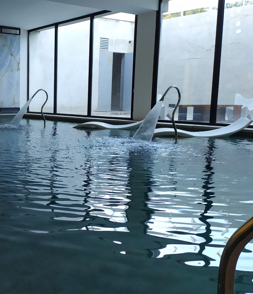 Ésta piscina de interior completamente revestida en cerámica Palau, climatizada, con cascadas y Solarium Húmedo realizada con materiales de primer nivel y accesorios que la hacen única.