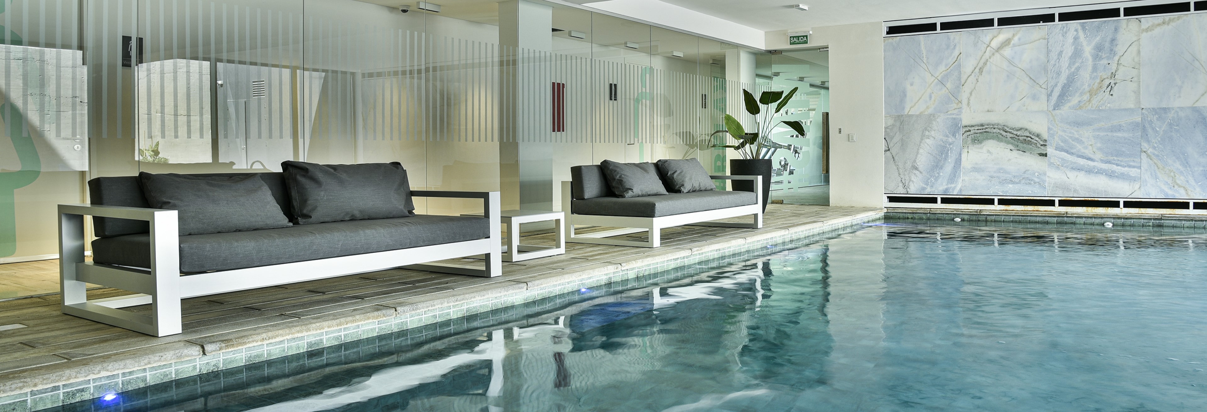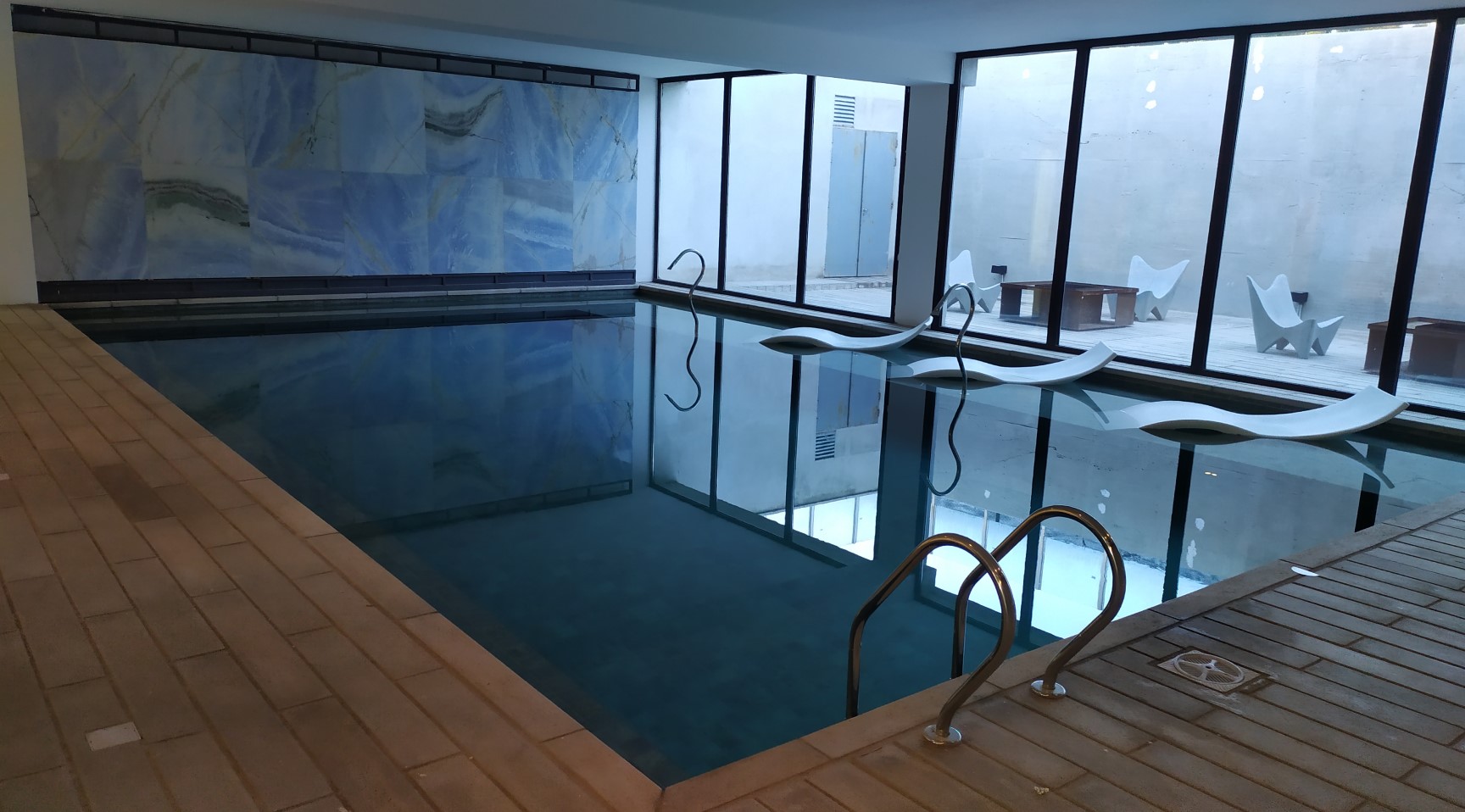 Ésta piscina de interior completamente revestida en cerámica Palau, climatizada, con cascadas y Solarium Húmedo realizada con materiales de primer nivel y accesorios que la hacen única.
